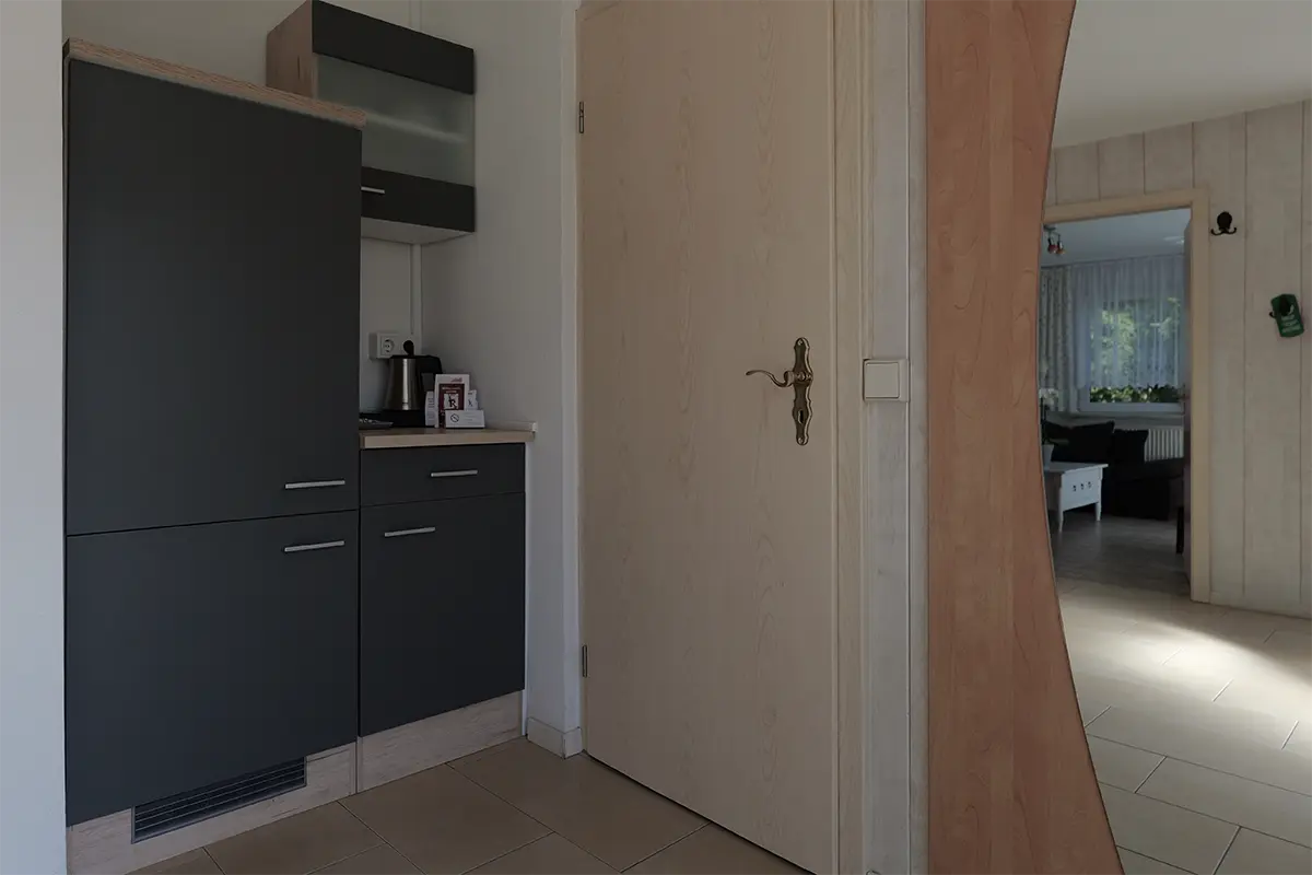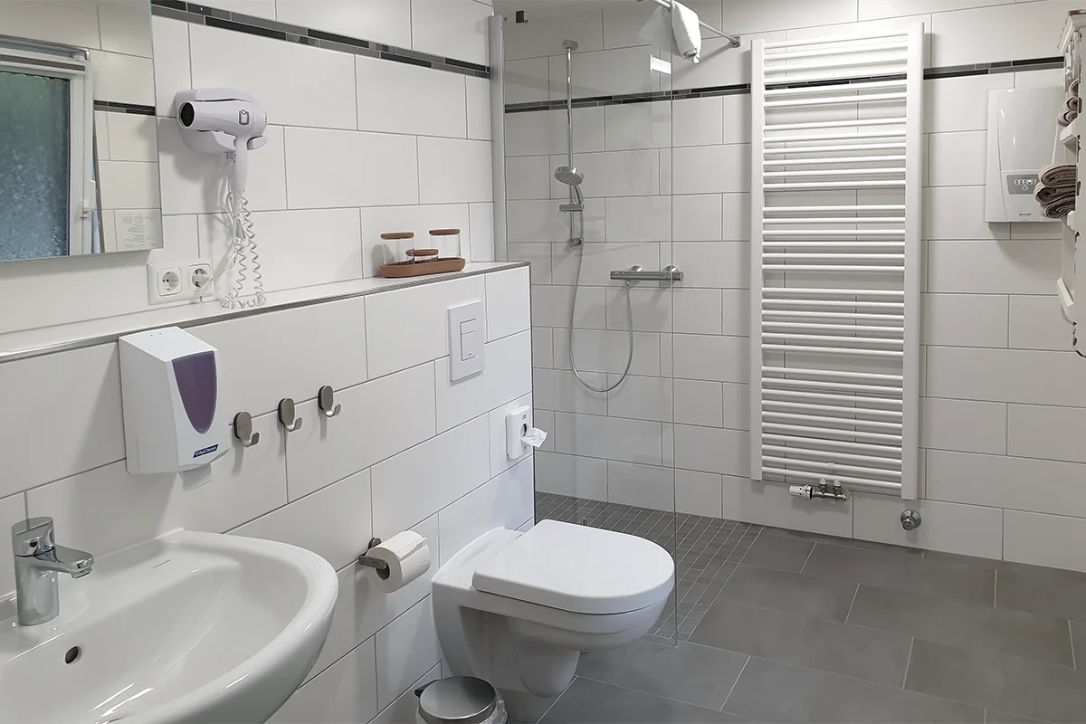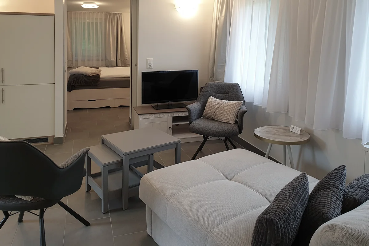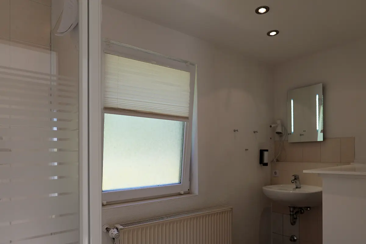 7 Einzel- bzw. Doppelzimmer mit Dusche und WC, TV, Teestation, Schreibtisch, Erdgeschoß, auch für 2 Personen mit Maxibett (140x200 cm) buchbar.