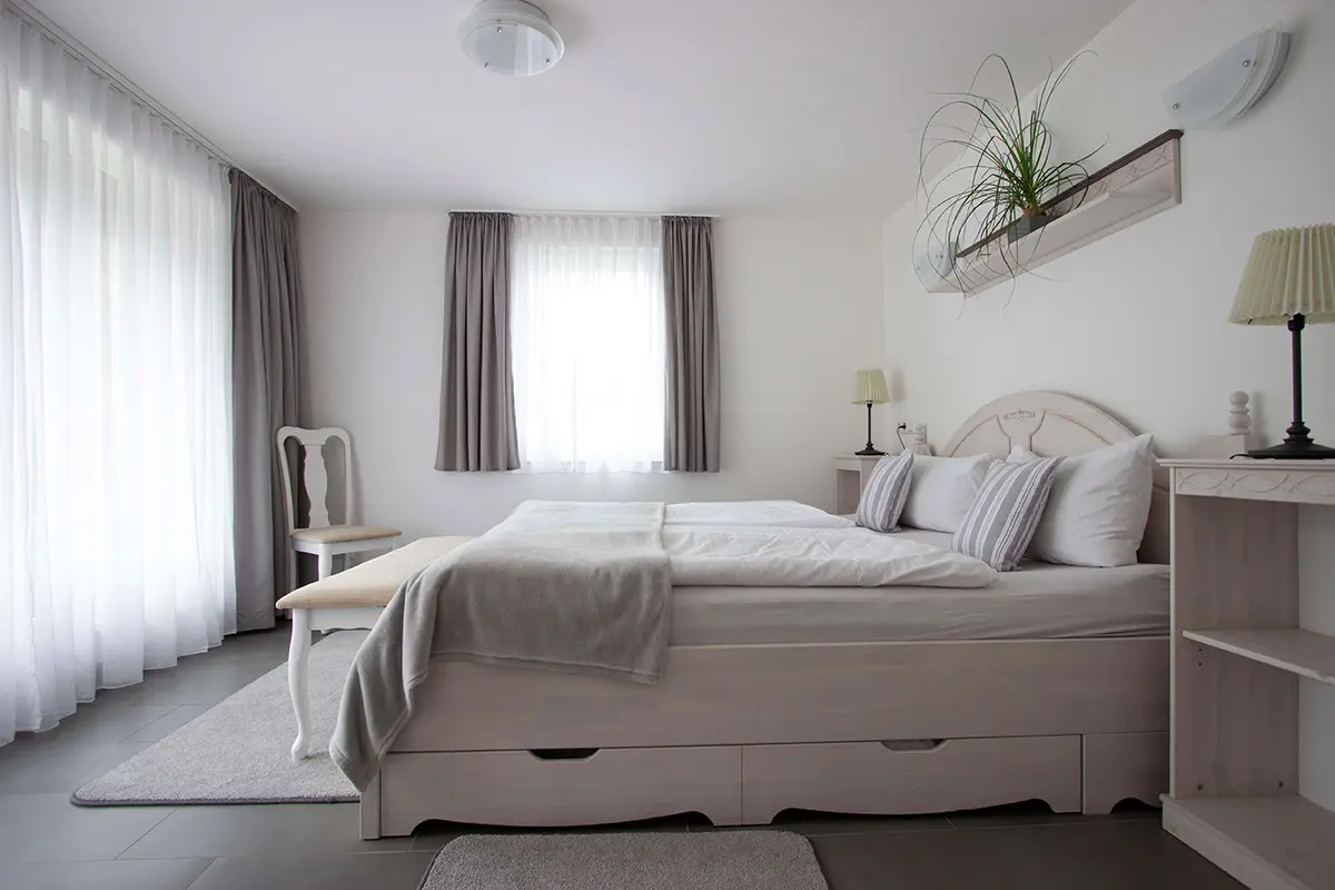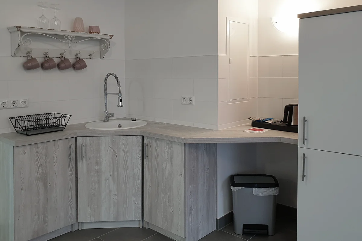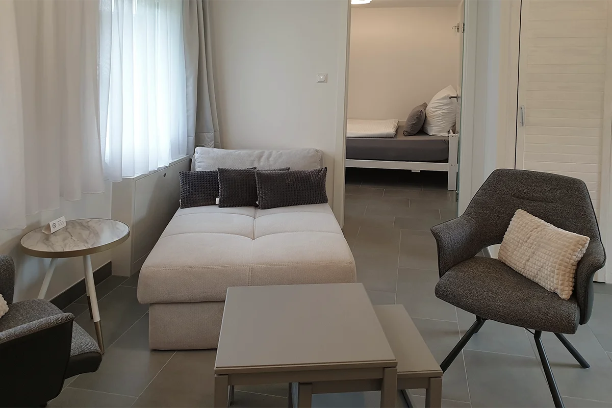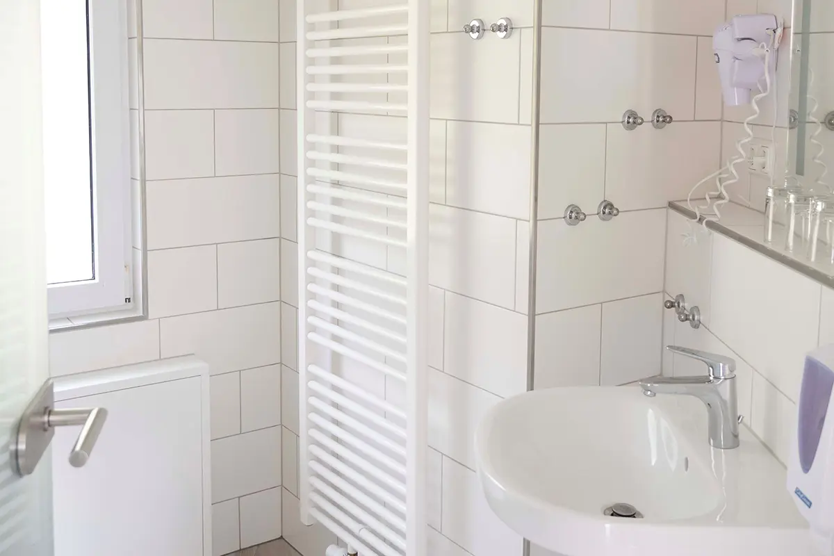 7 Einzel- bzw. Doppelzimmer mit Dusche und WC, TV, Teestation, Schreibtisch, Erdgeschoß, auch für 2 Personen mit Maxibett (140x200 cm) buchbar.